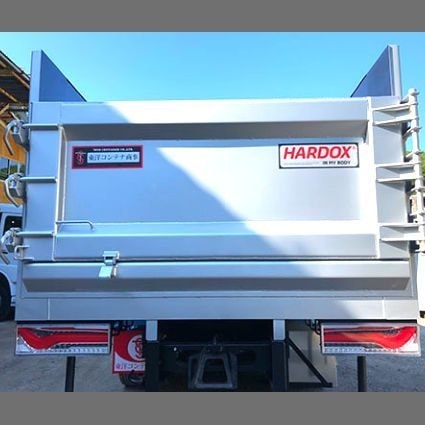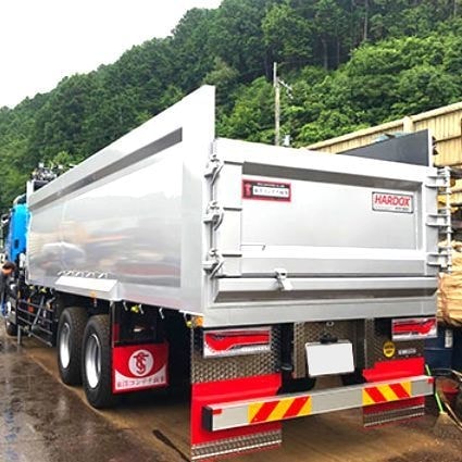 寸法:(内寸) ●L8000×W2300×H1600 角底仕様 使用材料: 底板:sus304 6t 横板:HARDOX450 4t 前板:HARDOX450 4t 扉板:HARDOX450 4t |