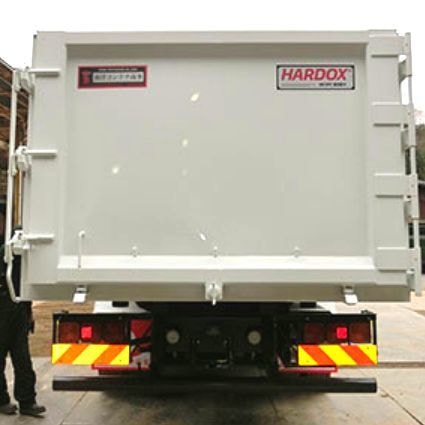 寸法:(内寸) ●L8500×W2300×H1600 100R仕様 使用材料: 底板:HARDOX450 6t 横板:HARDOX450 4t 前板:HARDOX450 4t 扉板:HARDOX450 4t |