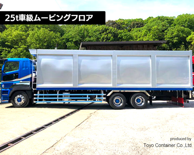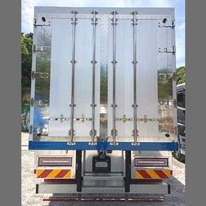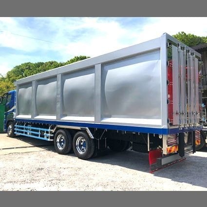| 寸法:(内寸) ●L9500×W2330×H2260 角底仕様 使用材料: 底板:アルミプロファイル8mm 21列 横板:HARDOX450 2.5t 前板:HARDOX450 3.2t 扉板:アルミブロック材 |