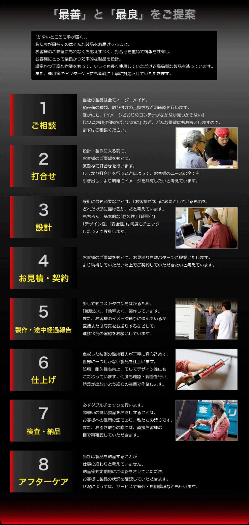 New-Production ボデー架装 「最善」と「最良」をご提案 ―ボデー架装― お客様のご要望に応じて、1から設計及び重量計算を行います。≪ご要望・最良かつ効率的で安全な製品を設計≫少しでも長く使用していただける高品質で丈夫な製品を造っています。